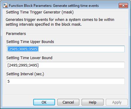Чтобы определить, когда система находится в устойчивом состоянии, блок Генерировать события времени настройки генерирует события настройки. Этот блок посылает сигналы запуска по фронту на блок моментального снимка рабочей точки, когда частота вращения двигателя достигает 2500, 3000 и 3500 об/мин в течение как минимум пяти секунд.
