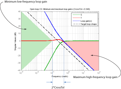Когда L намного больше 1, минимальное ограничение усиления на inv(S) (зеленая затененная область) эквивалентна ограничению минимального усиления на L. Аналогично, где L намного меньше 1, ограничение максимального усиления на T (красная затененная область) эквивалентна ограничению максимального усиления на L. Зазор между этими двумя ограничениями в два раза превышает допуск пересечения, который определяет полосу частот, в которой усиление контура может пересекать 0 дБ.