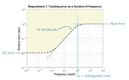 Максимальный профиль ошибок можно указать непосредственно как функцию частоты. В качестве альтернативы можно указать цель отслеживания - целевую ошибку DC, пиковую ошибку и время отклика. Эти параметры преобразуются в следующую передаточную функцию, описывающую максимальную ошибку отслеживания частотной области: