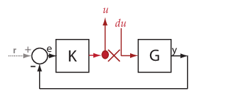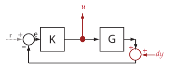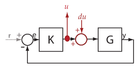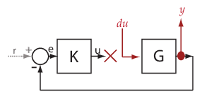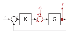 | Задает аддитивный вход в сигнал. Для определения передаточной функции для линеаризованной системы можно использовать входное возмущение с выходным измерением или выходом с разомкнутым контуром. Например, для вычисления отклика G/( 1 + GK) в примерной системе задайте входное возмущение du и выходное измерение y, как показано.