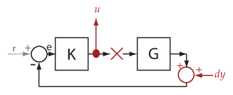| Задает выходное измерение с последующим разрывом цикла. Для линеаризации установки или контроллера можно использовать выход с разомкнутым контуром с входным возмущением или вход с разомкнутым контуром. Например, чтобы вычислить отклик -K в примерной системе, добавьте выход с разомкнутым контуром после K и входное возмущение dy после G, как показано. Выход с разомкнутым контуром разрывает поток сигнала и добавляет выходное измерение u.