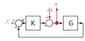 | Задает выходное измерение, за которым следует входное возмущение. Дополнительная функция чувствительности в точке представляет собой передаточную функцию от аддитивного возмущения в точке к измерению в той же точке. В отличие от функции чувствительности, возмущение добавляется после измерения. Эта точка анализа используется для вычисления функции передачи с замкнутым контуром вокруг контура. Например, чтобы вычислить функцию переноса с обратной связью для примерной системы, добавьте дополнительную точку анализа функции чувствительности, как показано на рисунке. Программа добавляет выходное измерение u с последующим и входным возмущением du. Функция передачи с обратной связью от du к u равна -KG/( 1 + KG).