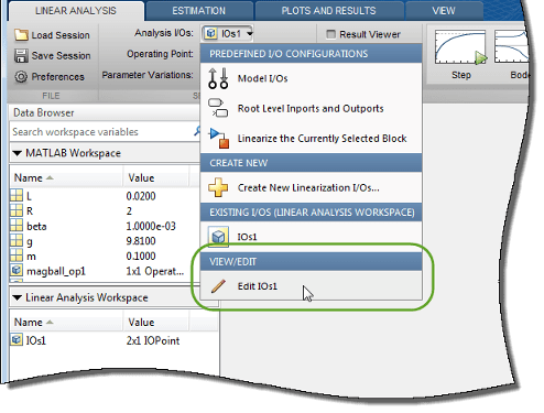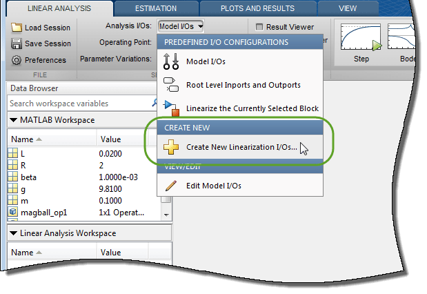 На вкладке «Линейный анализ» в раскрывающемся списке «Операции ввода-вывода анализа» выберите Create New Linearization I/Os.