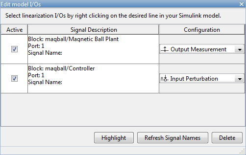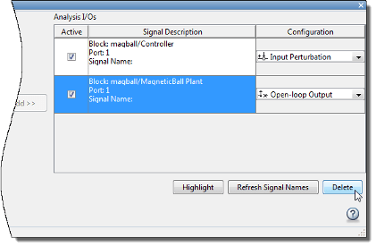 Чтобы удалить точку анализа из набора операций ввода-вывода линеаризации, в разделе «Операции ввода-вывода анализа» щелкните сигнал, который требуется удалить, и нажмите кнопку «Удалить».