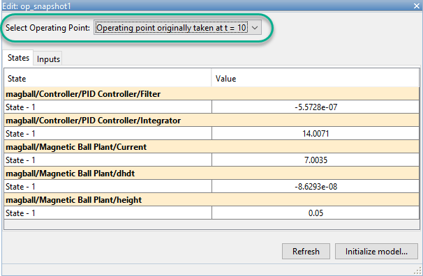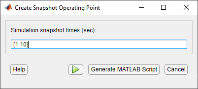 Чтобы найти операционные точки с помощью снимков, программа моделирует модель и создает операционную точку во время каждого снимка. Каждая операционная точка содержит входные значения и значения состояний модели в соответствующее время снимка.