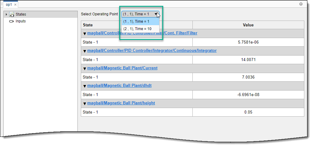 С помощью моделирования модели можно найти установившуюся рабочую точку. Результирующая рабочая точка состоит из значений состояния и входных уровней модели в заданное время снимка моделирования.