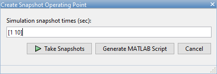 Укажите связи моделирования для создания снимков. Для этого примера сделайте снимки 1 и 10 единиц времени. В диалоговом окне «Создание рабочей точки снимка» в поле «Время снимка моделирования» введите [1 10].
