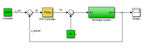 При работе в безаварийной среде номинальный вход величины 50 удерживает установку по ее постоянной траектории величины 2000. Любые нарушения могут привести к отклонению установки от этого значения. Задача PID контроллера состоит в добавлении небольшой коррекции к входному сигналу, которая возвращает систему к ее номинальному значению в течение разумного периода времени. Таким образом, ПИД-контроллер должен работать только над динамикой линейного отклонения, даже если сама установка может быть нелинейной. Таким образом, можно добиться эффективного управления нелинейной системой в некоторых режимах, разработав ПИД-контроллер для линейной аппроксимации системы в условиях равновесия.