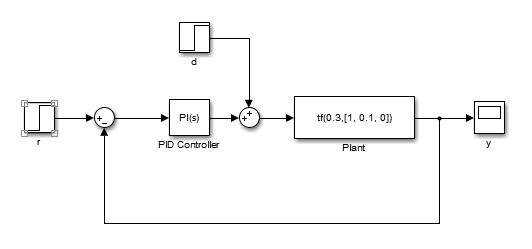 Модель также включает в себя опорный сигнал и ступенчатое возмущение на входе установки. Контрольное отслеживание - это ответ на y к опорному сигналу, r. Отклонение нарушения является мерой подавления при y введенного нарушения, d. При использовании PID-тюнера для настройки контроллера можно настроить конструкцию в пользу отслеживания ссылок или отклонения нарушений, как того требует приложение.