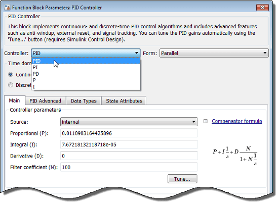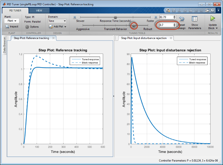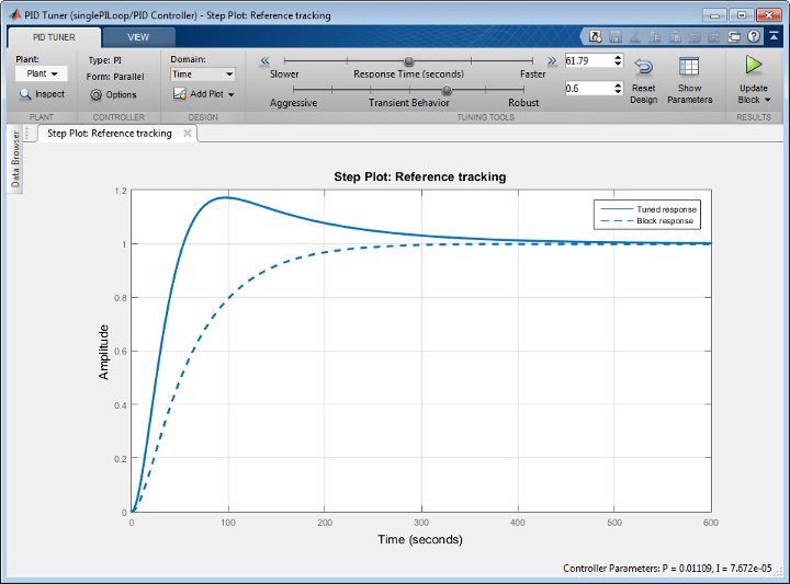 Контроллер в модели Simulink настроен как контроллер типа PI. Поэтому первоначальный контроллер, разработанный PID-тюнером, также имеет PI-тип.