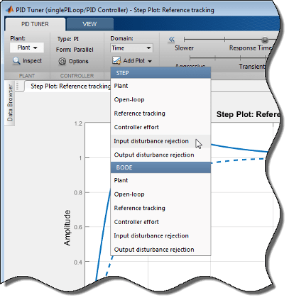 В зависимости от приложения может потребоваться изменить баланс между отслеживанием ссылок и отклонением возмущений в пользу одного или другого. Для PI-контроллера можно изменить этот баланс с помощью ползунка Переходное поведение (Transient Behavior). Переместите ползунок Поведение переходного процесса влево, чтобы улучшить отклонение возмущений. Ответы с первоначальным дизайном контроллера теперь отображаются как Block response (пунктирная линия).