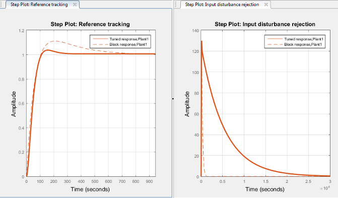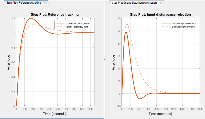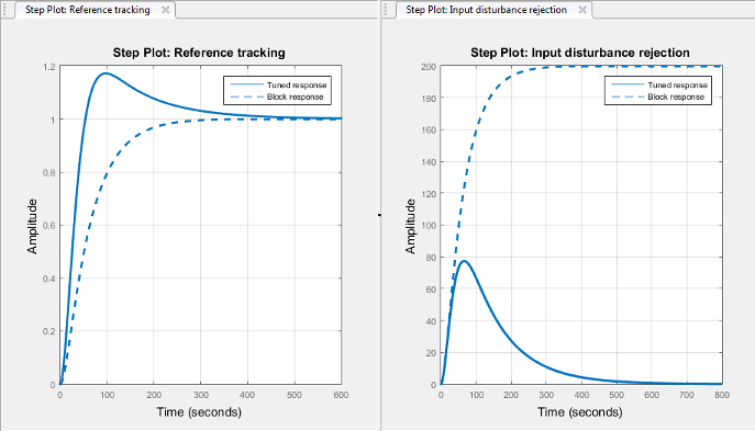 Как и в случае PI, первоначальный проект PID балансирует отслеживание ссылок и отклонение возмущений. В этом случае контроллер также дает некоторое превышение в отклике опорного отслеживания и подавляет входное возмущение с более длительным временем установки.