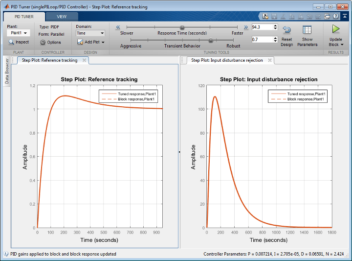 , чтобы обновить модель Simulink с помощью этой начальной конструкции контроллера. При этом также обновляются графики ответа блока в PID-тюнере, так что при изменении конструкции контроллера можно сравнить результаты с первоначальной конструкцией.