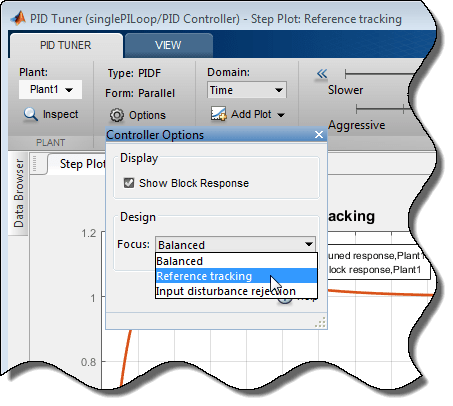 Измените фокус конструкции PID Tuner в пользу отслеживания ссылок без изменения времени отклика или коэффициента переходного поведения. Для этого нажмите «Параметры