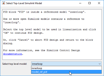 Если экземпляр ссылочной модели в обычном режиме отсутствует ни в одной открытой модели, настройка не может быть продолжена. В этом случае программное обеспечение выдает ошибку. Чтобы настроить блок контроллера PID, преобразуйте некоторые экземпляры ссылочной модели в открытой модели в обычный режим моделирования.