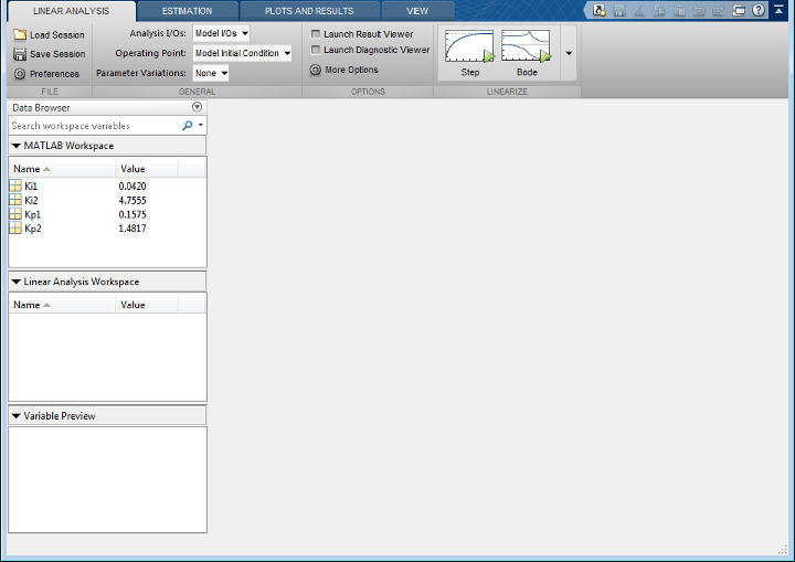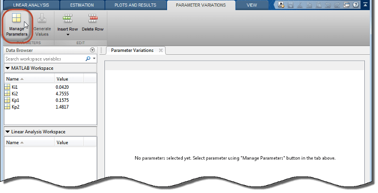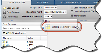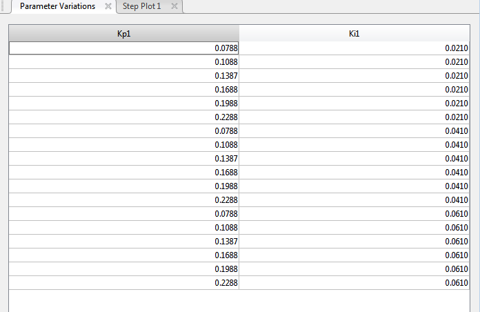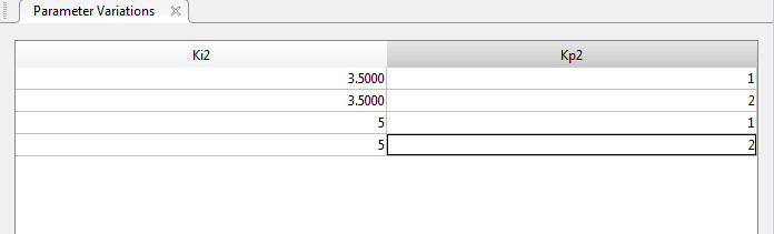 Выбранные переменные отображаются в таблице Вариации параметров (Parameter Variations). Каждый столбец в таблице соответствует одной из выбранных переменных. Каждая строка в таблице представляет одну (Ki2,Kp2) пара, у которой нужно линеаризовать. Эти комбинации значений параметров называются выборками параметров. При линеаризации линеаризатор модели вычисляет столько линейных моделей, сколько выборок параметров или строк в таблице.