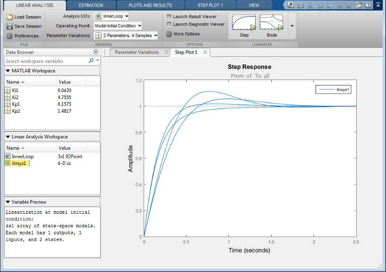 После определения вариаций параметров и набора операций ввода-вывода анализа для внутреннего цикла выполните линеаризацию модели и изучите график ответа шага. Щелкните