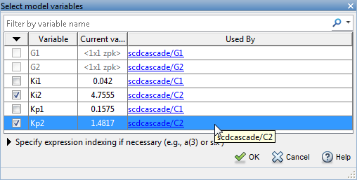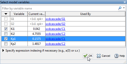 В диалоговом окне Выбрать переменные модели (Select model variables) выберите параметры для изменения. Ki2 и Kp2.