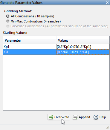 Перезаписать (Overwrite), чтобы заменить все значения в таблице Вариации параметров (Parameter Variations) сгенерированными значениями.