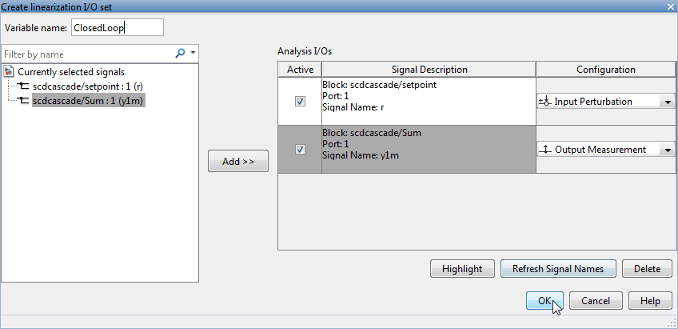 Поскольку требуется изучить общую функцию переноса с замкнутым контуром системы, создайте новый набор операций ввода-вывода линеаризации. На вкладке «Линейный анализ» в раскрывающемся списке «Операции ввода-вывода анализа» выберите Create New Linearization I/Os. Настроить r как входная точка возмущения и выход системы y1m в качестве выходного измерения. Нажмите кнопку ОК.