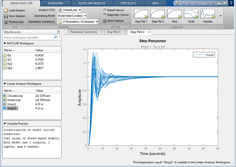 Линеаризатор модели линеаризует модель в каждой из выборок параметров, указанных в таблице Вариации параметров (Parameter Variations). Новая переменная, linsys1, появляется в разделе «Рабочее пространство линейного анализа» Обозревателя данных. Эта переменная является массивом state-space (ss) модели, по одной для каждой (Ki2,Kp2) пара. График показывает ответы на шаги всех записей в linsys1. Этот график дает представление о диапазоне ступенчатых откликов системы в рабочих диапазонах, охватываемых сеткой параметров.