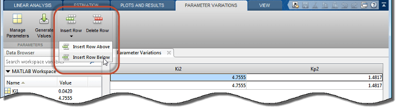 Укажите образцы параметров для линеаризации модели. В этом примере укажите четыре (Ki2,Kp2) пары, (Ki2,Kp2) = (3,5,1), (3,5,2), (5,1) и (5,2). Введите эти значения в таблицу вручную. Для этого выберите строку в таблице. Затем дважды выберите «Вставить строку» > «Вставить строку ниже».