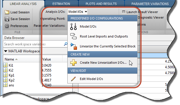 Для анализа производительности внутреннего контура извлеките передаточную функцию из входного сигнала внутреннего контура u1 на внутризаводский выпуск y2, вычисленное с разомкнутым внешним контуром. Чтобы задать этот ввод-вывод для линеаризации, на вкладке «Линейный анализ» в раскрывающемся списке «Анализ ввода-вывода» выберите Create New Linearization I/Os.