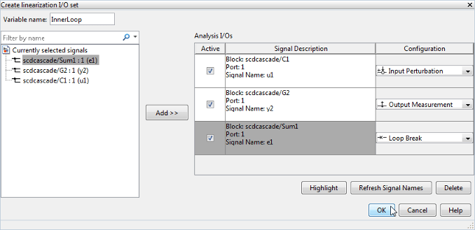 Назовите набор ввода-вывода путем ввода InnerLoop в поле Имя переменной диалогового окна Создать набор ввода/вывода линеаризации. Конфигурация диалогового окна показана на рисунке.