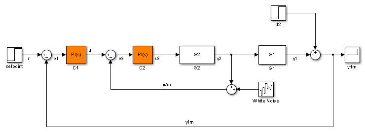 scdcascade модель, используемая в этом примере, содержит пару каскадных контуров управления с обратной связью. Каждый контур включает в себя PI-контроллер. Модели растений, G1 (внешний контур) и G2 (внутренний контур), являются моделями LTI. В этом примере для изменения параметров контроллера PI и анализа динамики внутреннего и внешнего контуров используется линеаризатор модели.
