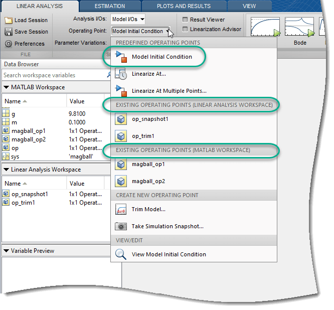Операционная точка, указанная в разделе Существующие рабочие точки (MATLAB Workspace) - эти операционные точки перечислены в браузере данных в разделе Рабочая область MATLAB.