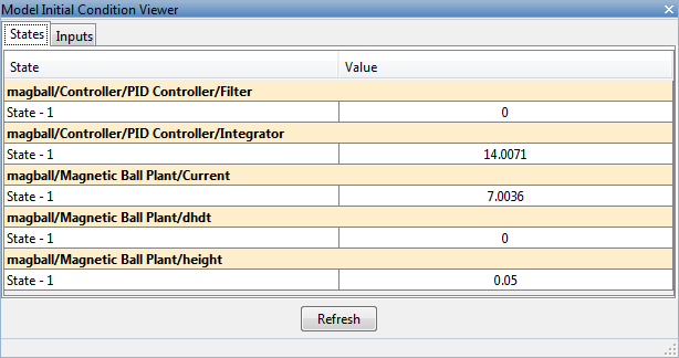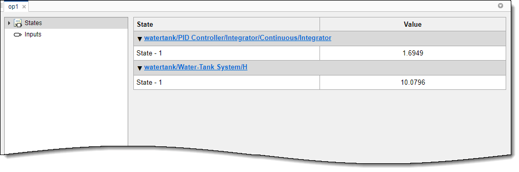 В открывшемся диалоговом окне отображаются значения рабочей точки. Для исходных условий модели и рабочих точек, найденных с помощью имитационных снимков, можно просмотреть входные значения и значения состояния. Для рабочих точек, найденных с помощью обрезки, можно также просмотреть выходные данные модели, соответствующие рабочей точке.