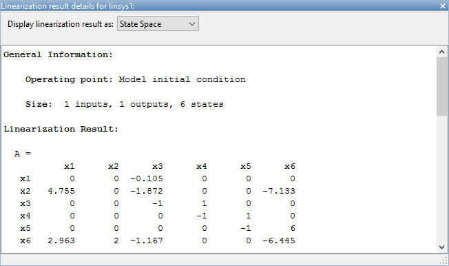 При линеаризации модели Simulink ® с помощью линеаризатора модели программа генерирует уравнения состояния-пространства для результирующей линейной модели. Для просмотра уравнений линеаризованной модели: