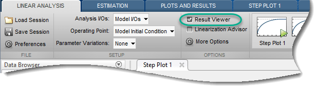 При линеаризации модели можно автоматически открыть диалоговое окно Сведения о результатах линеаризации (Linearization result details). Для этого перед линеаризацией модели на вкладке Линейный анализ (Linear Analysis) выберите Просмотр результатов (Result Viewer).
