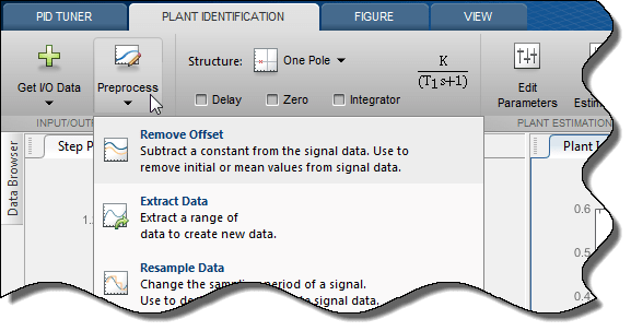 В PID Tuner можно предварительно обработать данные завода перед их использованием для оценки. После импорта данных ввода-вывода на закладке «Идентификация завода» с помощью меню «Предварительная обработка» выберите операцию предварительной обработки.