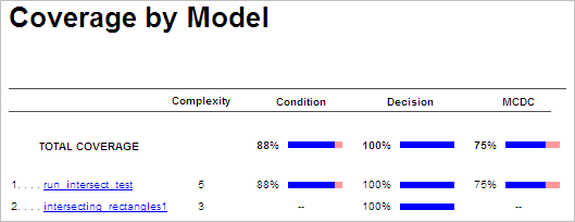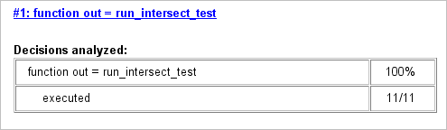 Верхняя половина отчета для функции суммирует результаты модельного покрытия. Метрики покрытия для run_intersect_test включают решение, условие и покрытие MCDC. Эти показатели лучше всего понять, изучив код для run_intersect_test.