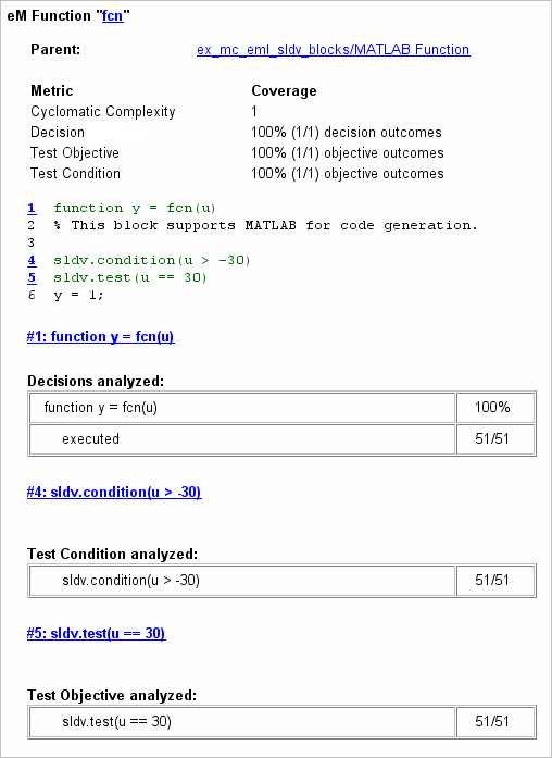 Подробный пример отчета о покрытии модели для функции MATLAB во внешнем файле см. в разделе Отчет о покрытии внешнего файла MATLAB.