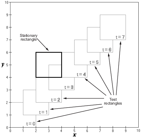 Фиксированный прямоугольник выделен полужирным шрифтом с нижним левым началом координат (2,4) и ширина и высота 2. В момент времени t = 0, первый тестовый прямоугольник имеет начало координат (0,0) и ширина и высота 2. Для каждого последующего образца начало тестового прямоугольника увеличивается на (1,1). Прямоугольники во время выборки t = 2, 3, и 4 пересекаются с тестовым прямоугольником.