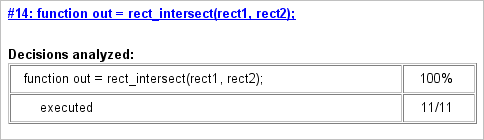 Покрытие для линии 14. Таблица «Решения проанализированы» показывает, что локальная функция rect_intersect выполняется во время тестирования, получая таким образом 100% покрытия.