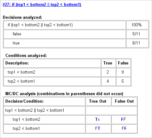 Проанализированная таблица условий проливает дополнительный свет на решение в строке 27. Поскольку это решение состоит из двух условий, связанных логическим ИЛИ (||) операция, только одно условие должно оценить true для принятия решения true. Если первое условие имеет значение true, нет необходимости оценивать второе условие. Первое условие, top1 < bottom2, был оценен восемь раз и был true дважды. Это означает, что второе условие оценивалось только шесть раз. Только в одном случае true, что приносит общую сумму true случаи принятия решения до трех, как указано в таблице «Решения проанализированы».