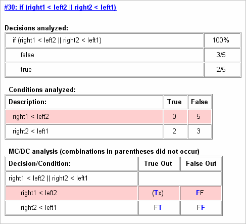 Покрытие для линии 30. Решение по строке 30, if (right1 < left2 || right2 < left1), вложен в if утверждение решения по строке 27 и оценивается только в том случае, если решение по строке 27 false. Потому что оценено решение по строке 27 false пять раз, строка 30 оценивается пять раз, три из которых false. Потому что оба true и false достигаются результаты, охват принятия решений для строки 30 составляет 100%.