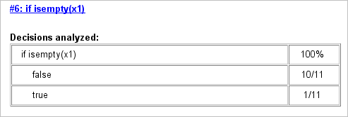 Покрытие для линии 6. Таблица «Решения проанализированы» показывает, что решение в строке 6, if isempty(x1), выполнил в общей сложности восемь раз. При первом выполнении решение было оценено true, включение run_intersect_test для инициализации значений его постоянных данных. Остальные семь раз, когда было исполнено решение, оно оценивало false. Поскольку произошли оба возможных результата, охват принятием решений составляет 100%.