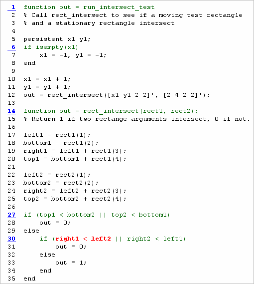 Первая строка каждой функции MATLAB, сконфигурированной для генерации кода, получает анализ покрытия, указывающий на решение запустить функцию в ответ на вызов. Покрытие для run_intersect_test указывает, что он был выполнен хотя бы один раз во время моделирования.