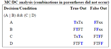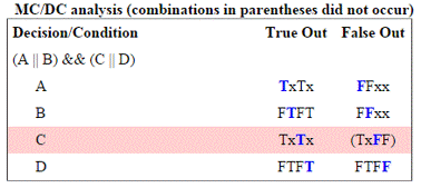 Для выражения (A | | B) & & (C | | D) изменение значения условия C также изменяет значение условия A. Из-за взаимозависимости условий A и C, уникальная причина MCDC для условия C не может быть достигнута: