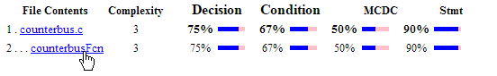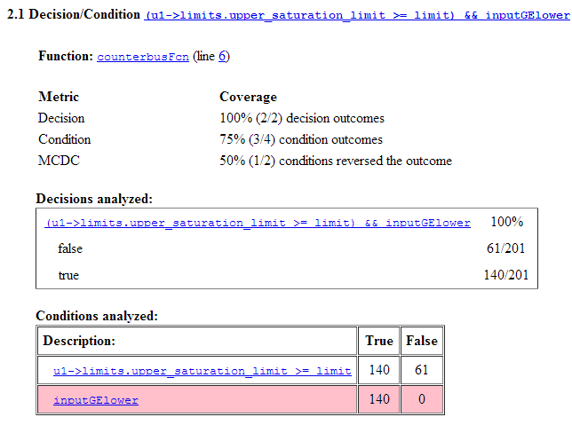 Условия, решения или результаты MCDC, которые не были протестированы во время моделирования, выделены розовым цветом. В подробных данных файла или функции выполните прокрутку вниз, чтобы отметить эти случаи и изучить их дополнительно.