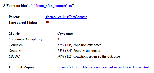 Результаты покрытия для S-функциональных блоков можно просмотреть в том же отчете, что и остальные элементы модели. Для каждого S-функционального блока отчет связан с подробным отчетом о покрытии для кода C/C + + в блоке.