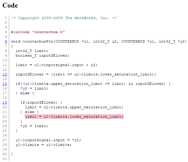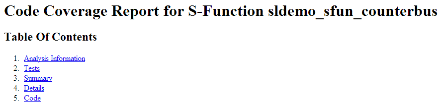 Для просмотра полного отчета о покрытии кода, используемого в этом примере, выполните шаги в разделе Покрытие для S-функций.