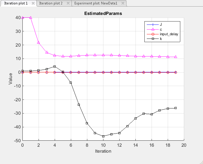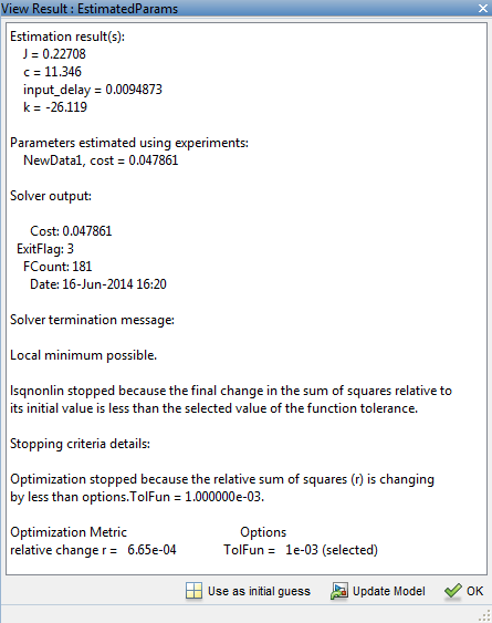 Оценочные параметры сохраняются в окне «Оценка параметров» (Parameter Estimator) в разделе «Результаты» (Results) панели «Обозреватель данных» (Data Browser) как EstimatedParams. Щелкните правой кнопкой мыши EstimatedParamsи выберите Открыть... для просмотра результатов.