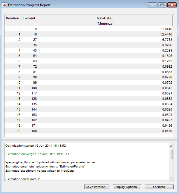 Программа Simulink Design Optimization использует методы оптимизации для оценки параметров модели. В каждой итерации оптимизации моделируется модель с текущими значениями параметров. Он вычисляет и минимизирует погрешность между моделируемым и измеряемым выходом. Оценка завершается, когда метод оптимизации находит локальный минимум.