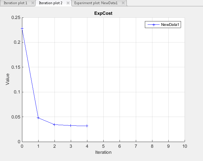 Чтобы добавить графики хода выполнения, щелкните Добавить график (Add Plot) на вкладке Оценка параметров (Parameter Estimation). Здесь можно выбрать графики итерации «Траектория параметров» и «Оценочные затраты». Можно также выбрать график эксперимента измеренных и смоделированных данных для NewData1.