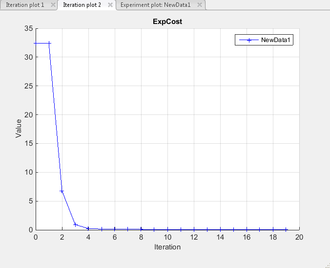 Изучите график расчетной функции затрат. Функция затрат - это погрешность между моделируемым и измеряемым выходом. Во время оценки метод оптимизации по умолчанию Nonlinear least squares, lsqnonlinминимизирует функцию затрат путем изменения значений параметров. На следующем рисунке показано изменение ожидаемых затрат во время итераций.